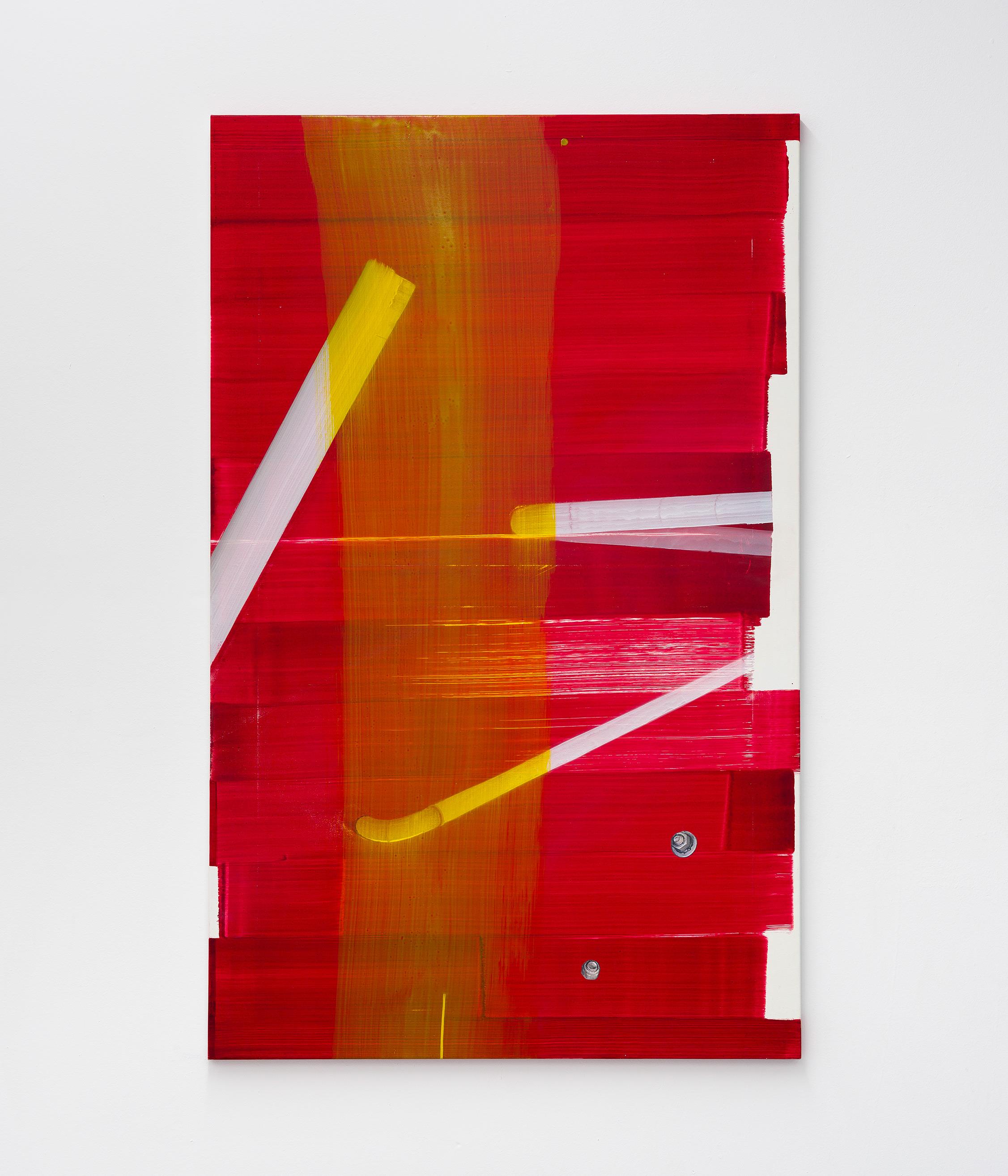 Davies shares with minimalism an engagement with the rhetoric of power and the violence of infrastructure. Untitled depicts a kind of piss stream in contrast to Coupling’s shit pour. Highly saturated red horizontal strokes cover the canvas, over which flows a vertical wash of toxic yellow, evoking spillage and chemical exposure. Three pipes are imposed—vertical, diagonal, and curved like a hockey stick. The pipes are impossible by the rules of classical perspective, rendered as if seen from multiple vantages at once, inverting our fantasy of fixed perspective and throwing the viewer into motion instead. With its delicate and diaphanous layers, thinned-out brushstrokes, and matte finish, this painting is perhaps most closely in dialogue with Harvey Quaytman’s tactile minimalism, one of Davies’s prominent influences. There’s a strange, sickly eroticism, visual heat without release. The pipes, which appear soiled in other paintings, seem to have cleaned themselves off in this one, but at the price of this noxious neon remainder.